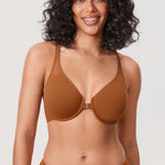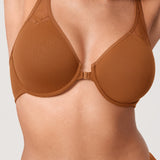 This front-close underwired bra features seamless fabric and racerback design. Mesh window details above cups are a great decoration. Low center front closure design makes it more convenient to put on and off easily